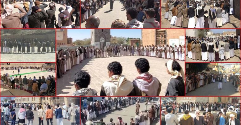 وفي الوقفات التي توزعت على مختلف المديريات والعزل والقرى في المحافظات الحرة، رفع المشاركون شعارات العزة والحرية والنفير العام، مؤكدين استمرار التعبئة والتحشيد وتعزيز الجهوزية القتالية والروحية لمواجهة الأعداء وعملائهم، وإفشال مخططاتهم التي تستهدف اليمن وأمنه ووحدته وسيادته.