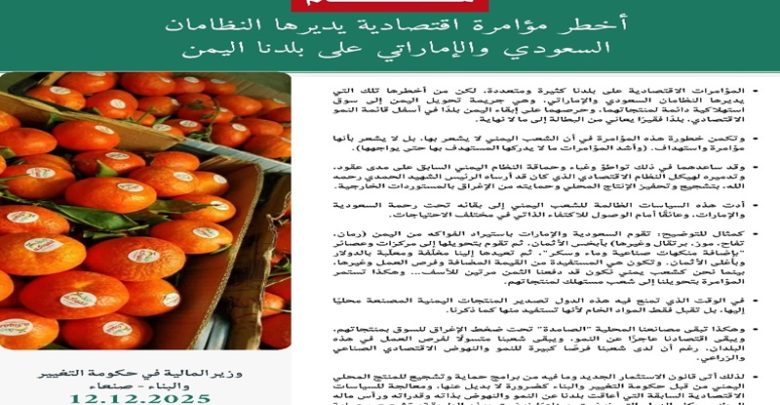 وأورد وزير المالية كمثال للتوضيح، “تقوم السعودية والامارات باستيراد الفواكه من اليمن”، ( رمان وتفاح وموز وبرتقال وغيرها) بأبخس الاثمان ثم تقوم بتحويلها الى مركزات وعصائر بإضافة منكهات صناعية وماء وسكر ثم تعيدها إلى اليمن مغلفة ومعلبة بالدولار وبأغلى الاثمان وتكون هي المستفيدة من القيمة المضافة وفرص العمل وغيرها بينما نحن كشعب يمني نكون قد دفعنا الثمن مرتين للأسف وهكذا تستمر المؤامرة بتحويل اليمنيين إلى شعب مستهلك لمنتجاتهم.