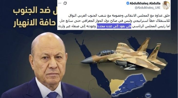 وجاء تصعيد إماراتي جديد متحديًا على لسان الأكاديمي الإماراتي عبد الخالق عبد الله، المعروف بقُربه من دوائر صنع القرار في أبوظبي؛ إذ أطلق تصريحات حادة، استهدفت رئيس ما يسمى “مجلس القيادة الرئاسي” رشاد العليمي.