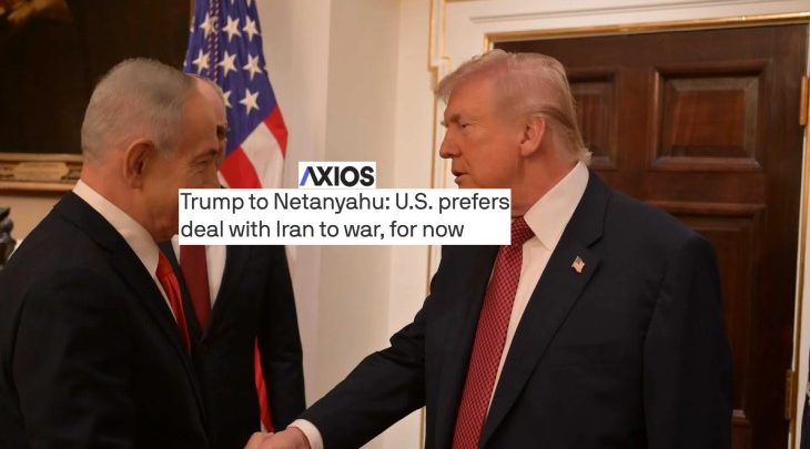 نقل موقع «أكسيوس» عن مصادر مطلعة أن الرئيس الأمريكي دونالد ترامب أبلغ رئيس وزراء الاحتلال بنيامين نتنياهو، خلال اجتماع بينهما، أن الولايات المتحدة تفضّل في المرحلة الراهنة التوصل إلى اتفاق مع إيران بدلًا عن اللجوء إلى العمل العسكري.