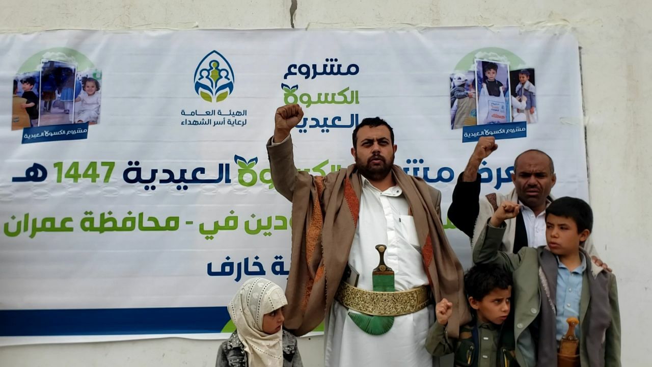 دشّن فرع الهيئة العامة لرعاية أسر الشهداء بمديرية خارف بمحافظة عمران اليوم مشروع توزيع كسوة العيد لأبناء الشهداء والمفقودين للعام 1447هـ
