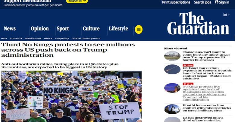 صحيفة “الغارديان”: ملايين الأمريكيين يشاركون في احتجاجات “لا للملوك” ضد إدارة ترامب وحرب إيران