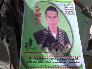 شيع المئات من أبناء مديرية السودة قرية بني موهب بمحافظة عمران اليوم الشهيد البطل/ يحى يحى محمد حيدرة في موكب جنائزي مهيب يتقدمه مشايخ وعقال واعيان وأهالي ومحبي الشهيد وجمعا غفيرا من أهالي المديرية