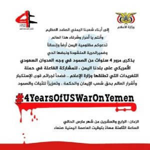 بمناسبة مرور 4 سنوات من العدوان السعودي الأمريكي الاماراتي على اليمن تدعوكم وزارة الإعلام اليمنية للمشاركة الفاعلة في حملة التغريدات والتى تفضح جرائم العدوان على #اليمن على الهاشتاغ