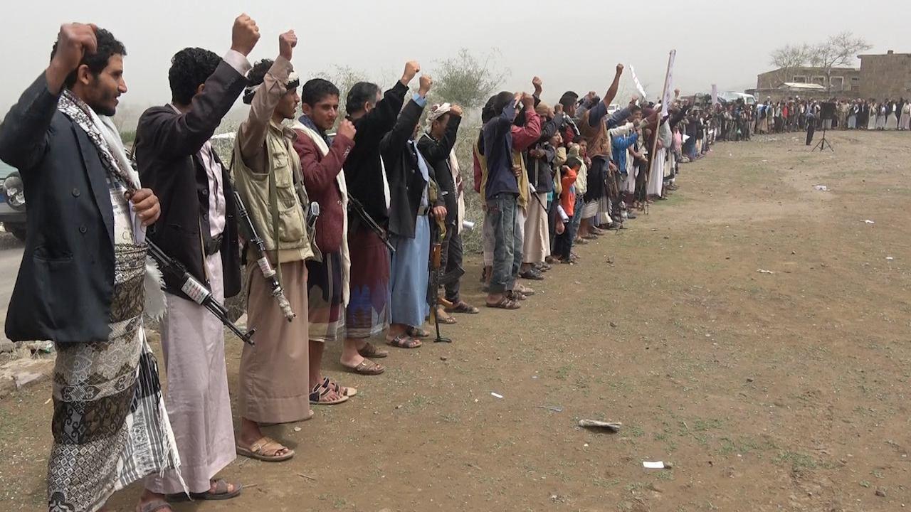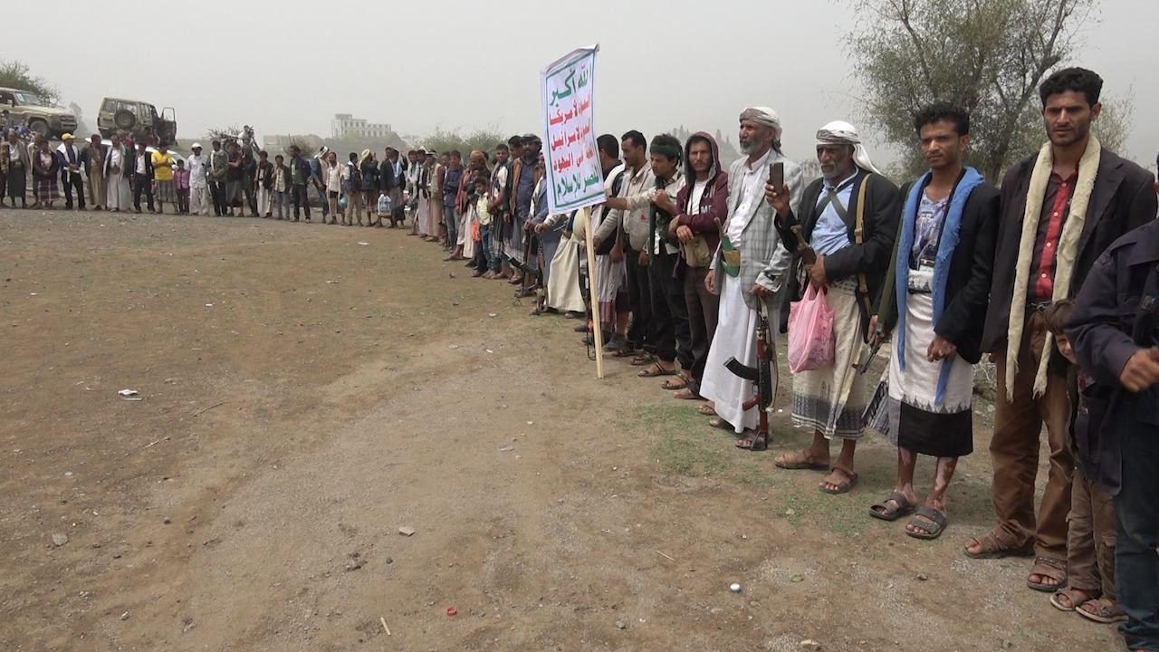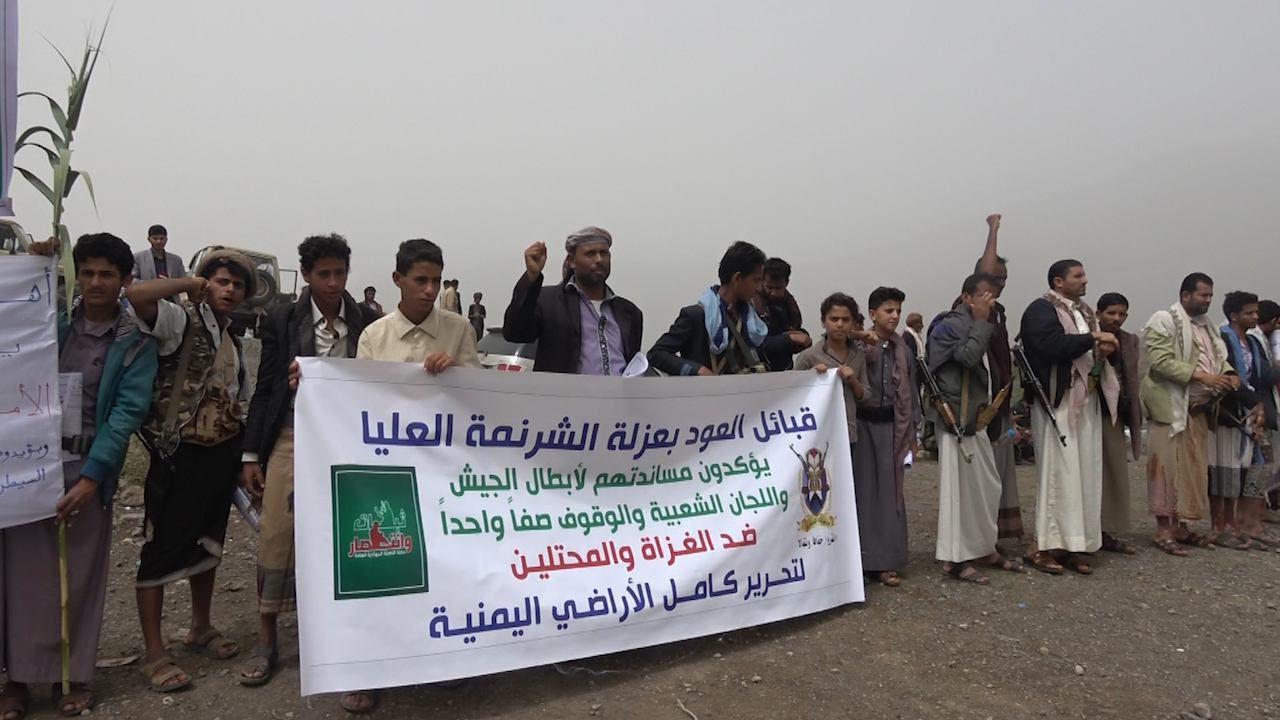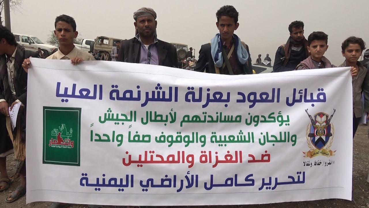 نظم أبناء عزلة الشرنمة العيا بمنطقة العود في محافظة إب، امس الأربعاء، وقفة قبلية حاشدة، أعلنوا فيها عن ترحيبهم ومساندتهم لقوات الحوثيين التي سيطرت على المنطقة خلال الأيام الماضية، والتوجه إلى جبهات القتال للمشاركة في مواجهة قوات التحالف السعودي الإماراتي وتحرير الأرض وصون العرض من الغزاة والمحتلين. حسب وصفهم.