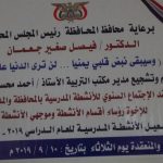 ترأس وكيل المحافظة رئيس الوحدة التربوية ومدير مكتب التربية والتعليم الأستاذ / أحمد محسن الشهاري الاجتماع السنوي للأنشطة المدرسية للعام الدراسي 2019/ 2020 م والذي ضم موظفي إدارة الأنشطة المدرسية بالمكتب ورؤساء أقسام وموجهي الأنشطة المدرسية بالمديريات