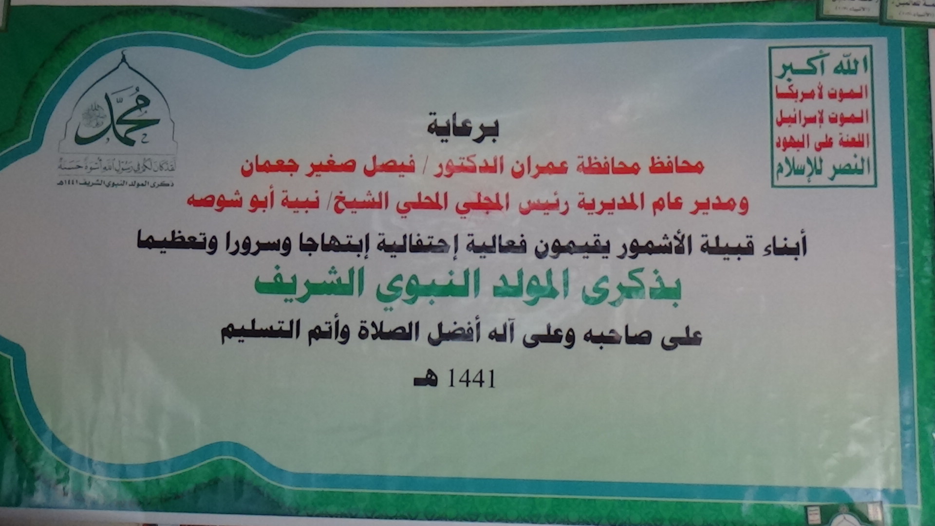 ودعا ابو شوصاء والشهاري قبائل الاشمور الى الاستعداد والحضور المشرف للفعالية الكبرى فعالية ذكرى مولد النبي الأكرم والتي ستقام بمحافظة عمران .
