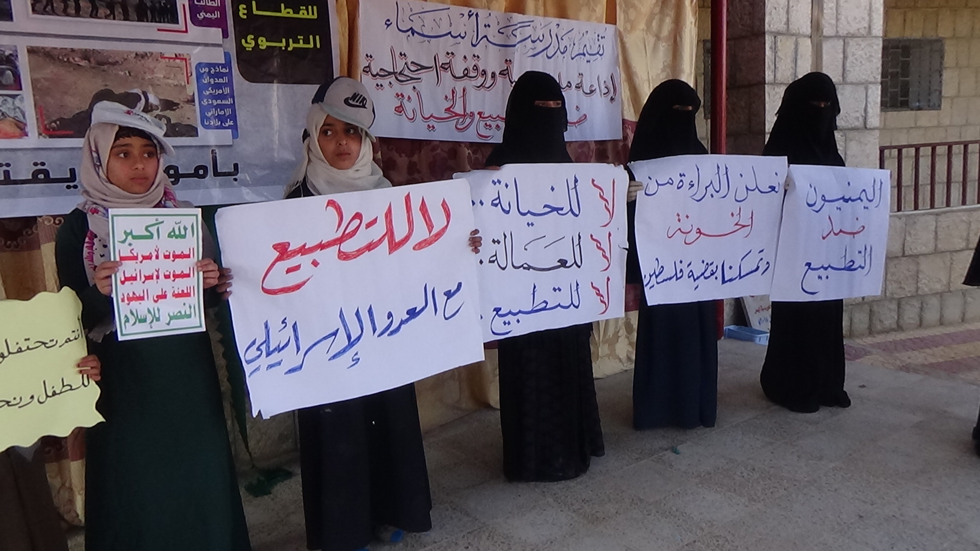 خلال الوقفة رفعت المشاركات لافتات رافضة للتتطبيع مع الكيان الصهيوني المغتصب وتحميل الأمم المتحده والمجتمع الدولي مسؤولية تمادي العدوان بارتكاب الجرائم بحق اليمن الأرض والإنسان.