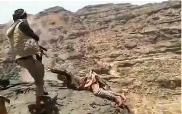 وحسب المشهد الذي وزع على نطاق واسع، ظهر المجاهد الأسير علي السنمان وهو جريح ومن حوله مجموعة من المرتزقة.. فأقدم أحدهم على إطلاق وابلاً من الرصاص على جسده حتى أرداه قتيلاً على الفور، ثم تولى مرتزق آخر على رمي جثمانه من أعلى الجبل بطريقة وحشية بشعة لا تدع مجال للشك بأن هذه العناصر الإرهابية مجردة من كل القيم الدينية والاخلاقية والإنسانية.