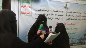 نظمت إدارة توعية المرأة بمكتب الأوقاف والإرشاد بمحافظة عمران مساء اليوم وقفة احتجاجية مسلحة نصرة للأقصى الشريف ورفضا للتطبيع مع الكيان الصهيوني .