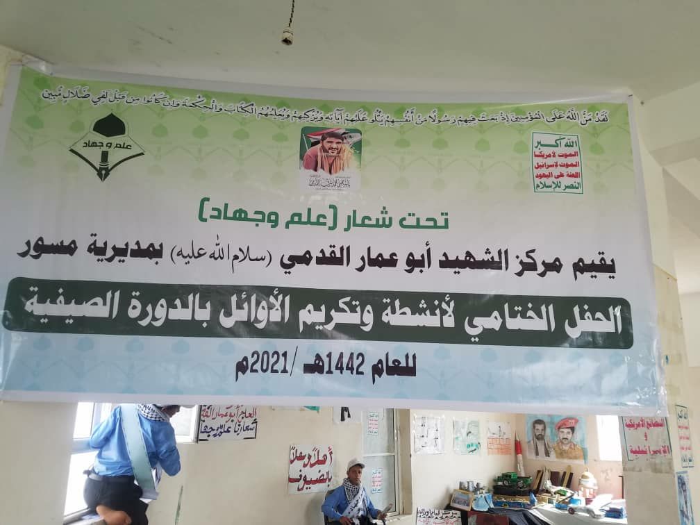 هذا كما عبر الحضور والضيوف الكرام من قيادة المحافظة بكلمات مختصرة للاخ عبدالله المنتصر والاخ مدير عام مكتب التربية ابو زيد رطاس رئيس اللجنة الفرعية للمدارس الصيفية بالمحافظة وكذا الاخ وكيل المحافظ الشيخ أمين فراص الجميع حيا وشكر عاملين وطلاب مركز الشهيد ابو عمار القدمي وكل مدارس مسور الصيفية مما شاهدوه من معنويات وفقرات قدمها الطلاب تشد الهمم وتحمل الوعي والثقافة القرآنية لمشروع المسيرة القرانية الذي جدده الشهيد القائد حسين بن بدر الدين الحوثي رضوان الله علية في مواجهة المشروع الصهيو أمريكي والذي يحمي الامة والاجيال من كل فسادهم وتضليلهم.
