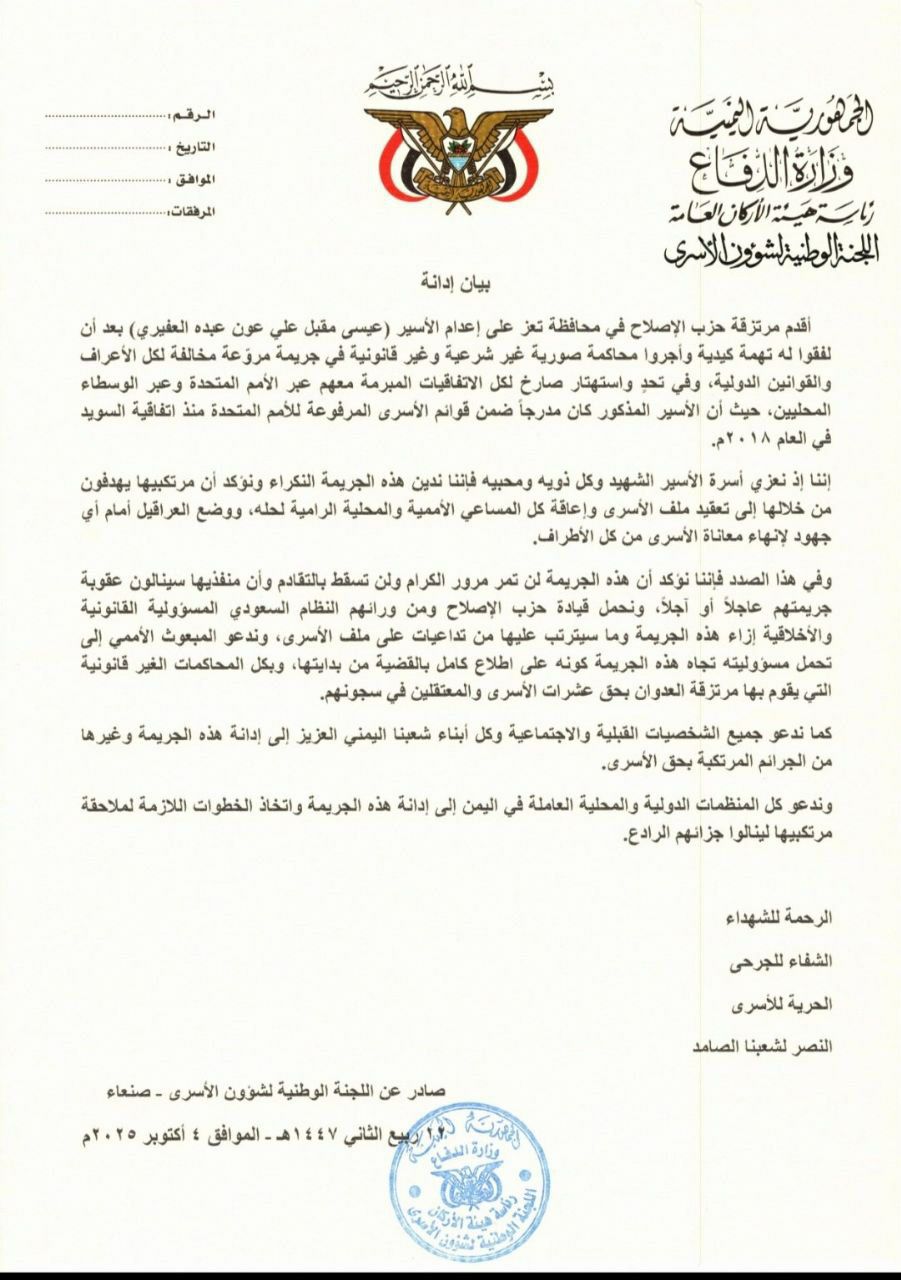 أدانت اللجنة الوطنية لشؤون الأسرى، إقدام مرتزقة حزب الإصلاح في محافظة تعز على إعدام الأسير عيسى مقبل علي عون العفيري، بعد أن لفقوا له تهمة كيدية وأجروا محاكمة صورية غير شرعية وغير قانونية.