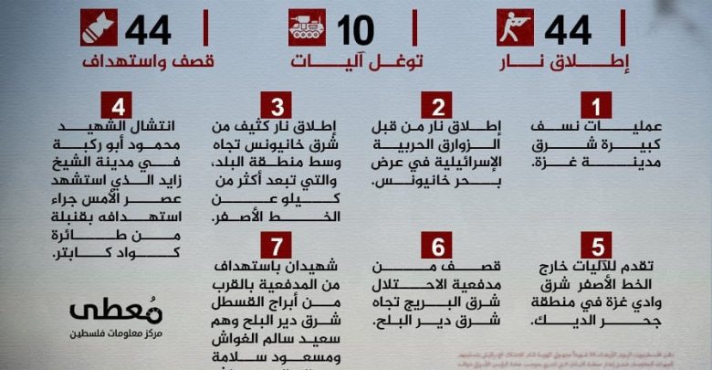 ونفذ العدو الإسرائيلي بـ 44 عملية إطلاق نار، و10 عمليات توغل للآليات في خلف الخط الأصفر، فضلاً عن 44 عملية قصف واستهداف في مناطق متفرقة من القطاع.