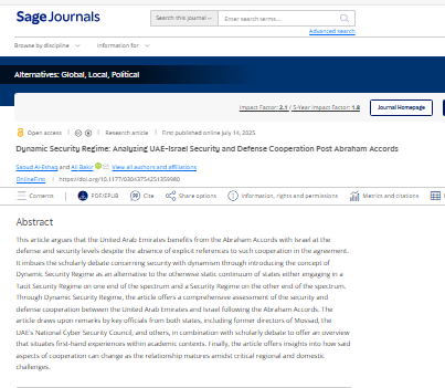 تُعدّ إسرائيل، من وجهة نظر الإمارات، مصدراً متقدّماً للتكنولوجيا الأمنية والعسكرية، ما يمنح أبو ظبي تفوّقاً استخبارياً في بيئة إقليمية متشابكة، تتنافس فيها مع قوى مثل إيران وتركيا وقطر، وفقاً لمجلة “SAGE Journals“ في دراسة بعنوان «الإطار الأمني الديناميكي: تحليل التعاون الأمني والدفاعي بين الإمارات وإسرائيل بعد اتفاقيات أبراهام» في تموز 2025، مضيفة أن «الإمارات تستفيد من الاتفاقات مع إسرائيل على مستويات الدفاع والأمن».