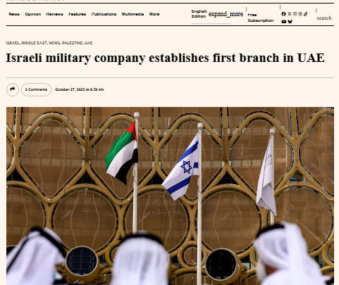 وفيما لا يزال عشرات الآلاف من الشهداء الفلسطينيين تحت الأنقاض ولا يزال الجيش الإسرائيلي يمنع دخول الغذاء والدواء والمساعدات والآليات والوقود والآليات الى قطاع غزة تسارع الامارات لافتتاح فرعاً لشركة أسلحة إسرائيلية في عاصمتها .