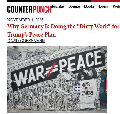 والحكومة الألمانية تريد أن تلعب دور الكمان الأول على الأقل بين الكمان الثاني في تنفيذ خطة ترامب للسلام، والتي تتضمن سياسة احتلال مكثفة، مع حرمان من حق التصويت والحصار على الدولة الفلسطينية من قبل إسرائيل والولايات المتحدة.